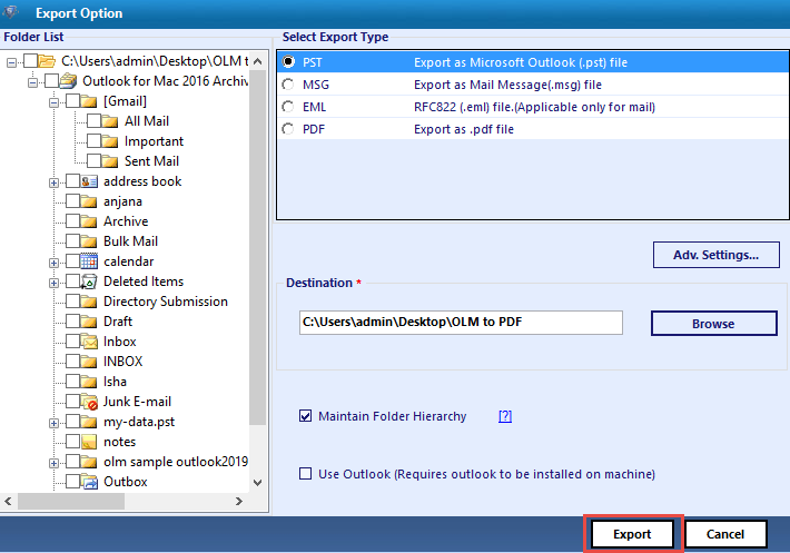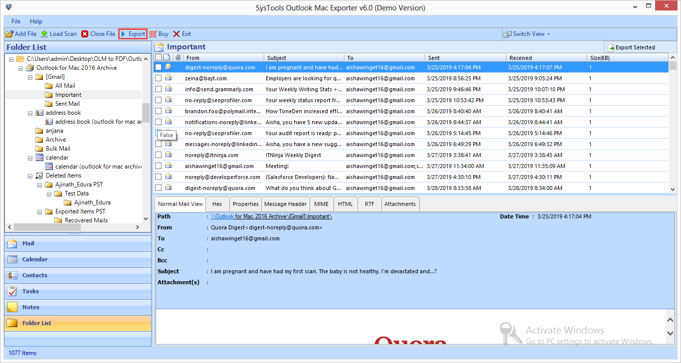 Step 10:Click on the Export Button to migrate all data items of OLM file together