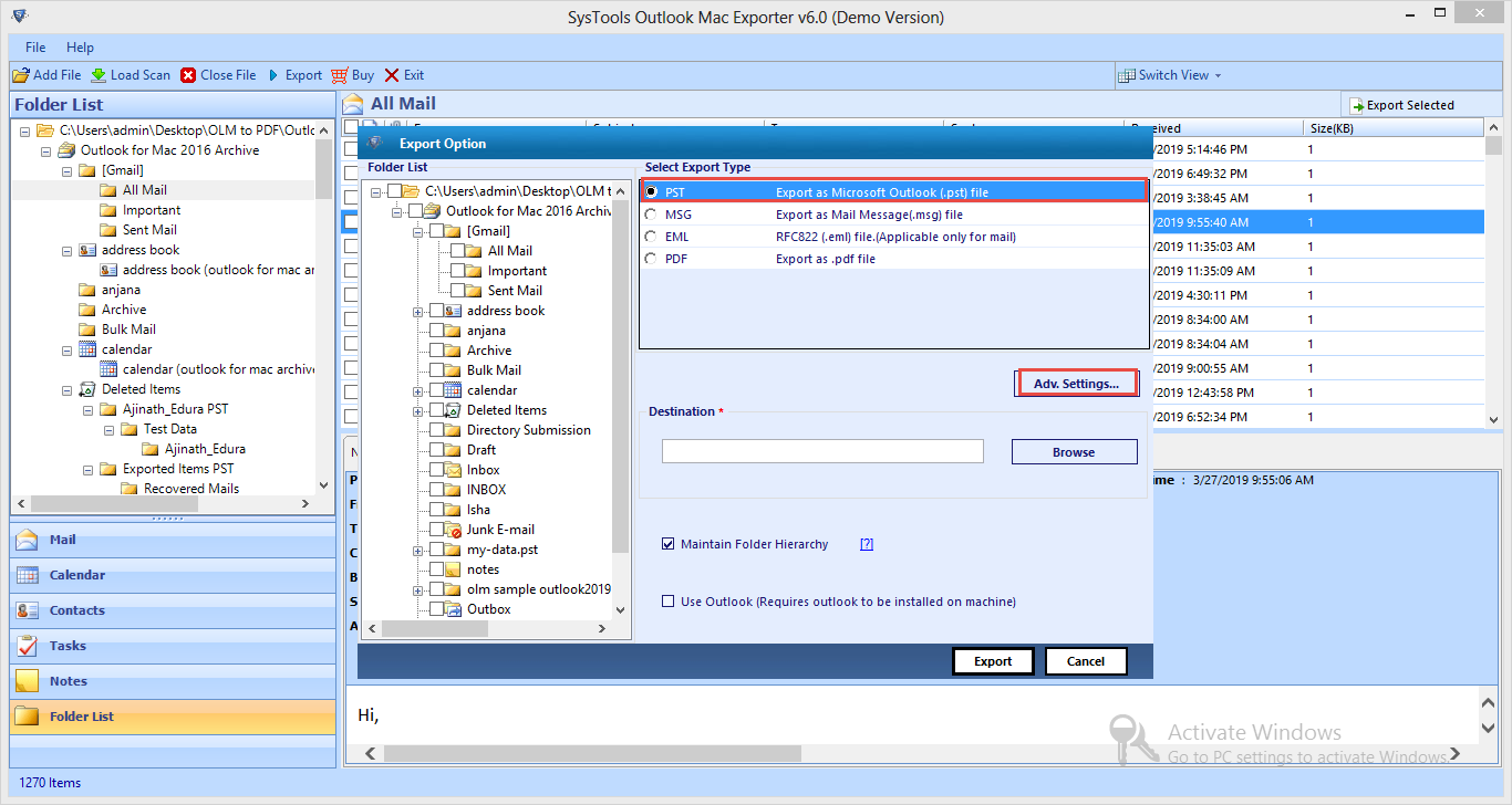Follow the Step by Step procedure to convert Outlook MAC OLM File to PST, EML or MSG formats using Outlook MAC Exporter